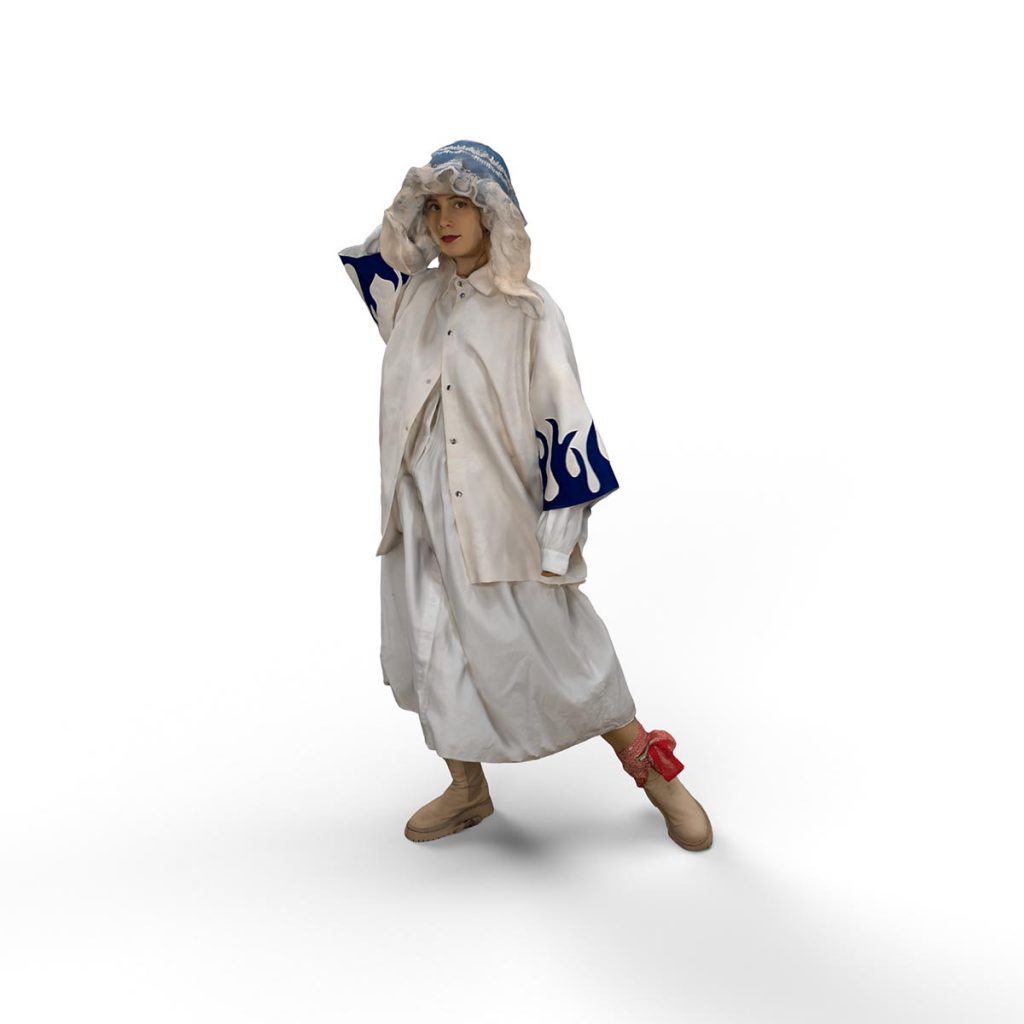 The semi-sheer lace material is a fabric that’s hard to capture in volumetric video, but it turned out much better than we expected. The blue knitted pants you see in the picture were designed by ODE TO GRANDMA (a tribute to all grandmothers). Nowadays there is a fashion gap between the young and older generation. Craftsmanship, knowledge and stories of the older generation is precisely a source of inspiration that ODE AAN OMA values and wants to show this in their work.