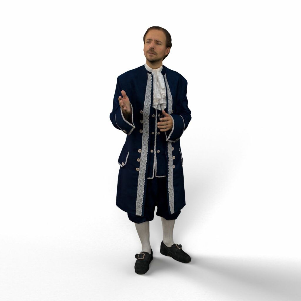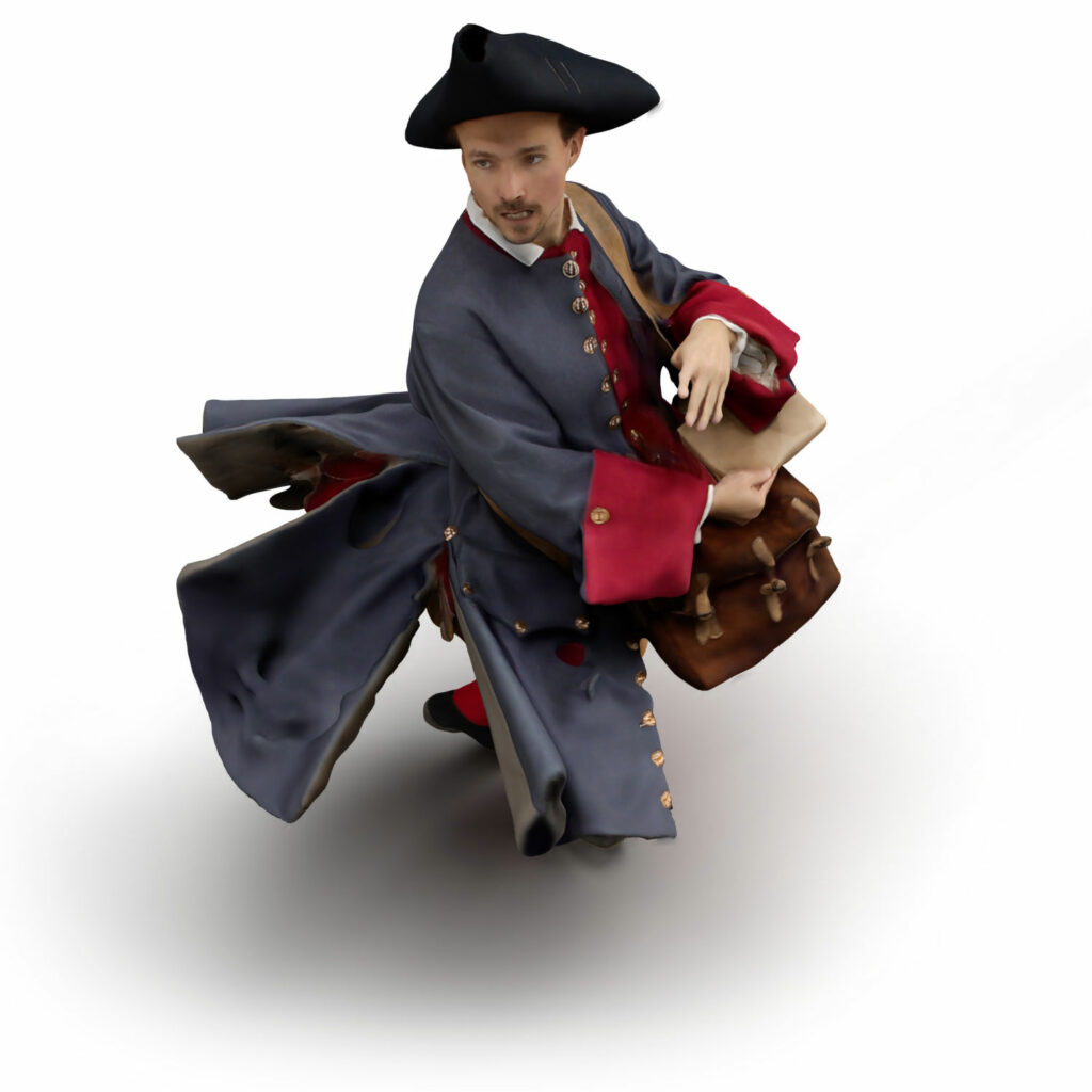 The historical characters have been captured in our volumetric capturing stage, so they will appear lifelike in front of you. For example, meet Guillaume Bex, a postman who is head over heels in love with a Baron’s chambermaid. How will that end?
