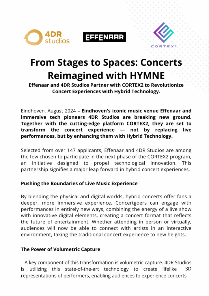 📍 Effenaar x 4DR Studios x CORTEX2 – geselecteerd uit 147 internationale inzendingen voor de volgende fase van het CORTEX2-programma. Lees het perbericht hieronder.