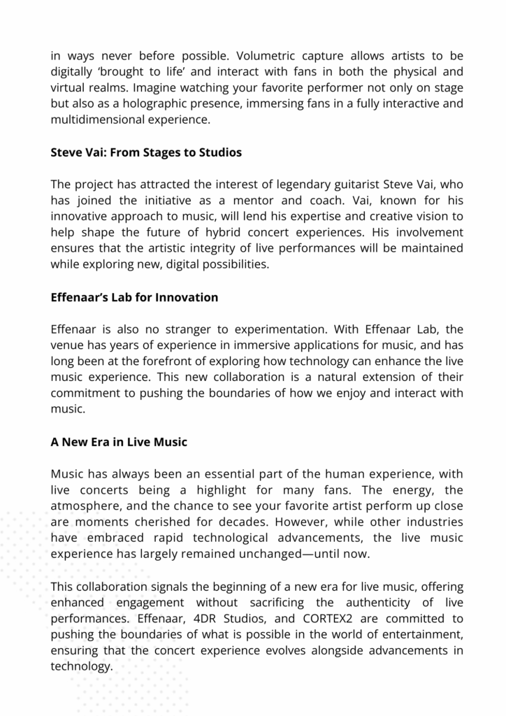 In samenwerking met Effenaar en cutting-edge platform CORTEX2 duikt 4DR Studios de toekomst in. Samen tillen we de concertbeleving naar een nieuw niveau – niet als vervanging van live shows, maar als next-level uitbreiding. Denk: optredens met digitale lagen, interactieve elementen en artiesten die holografisch tot leven komen.